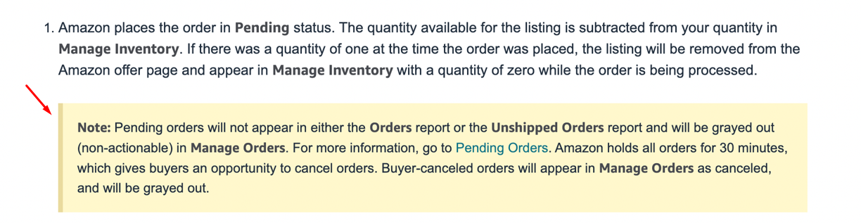 While most orders transition from "Pending" to "Unshipped" within 30 minutes, some orders may remain in pending status for longer periods, including: