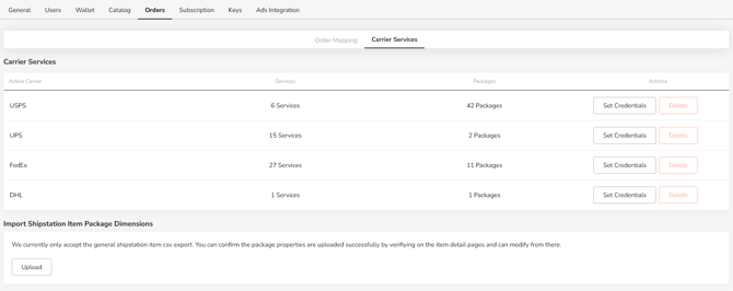 In SKUPREME, the "Set Credentials" button in the Order Settings facilitates the synchronization of your shipping carriers. This essential feature allows you to manage carrier credentials directly within the platform, optimizing logistics and leveraging cost-effective shipping rates. This guide provides detailed steps on how to integrate carrier services and how to utilize USPS at-cost shipping rates when no specific carrier credentials are set.